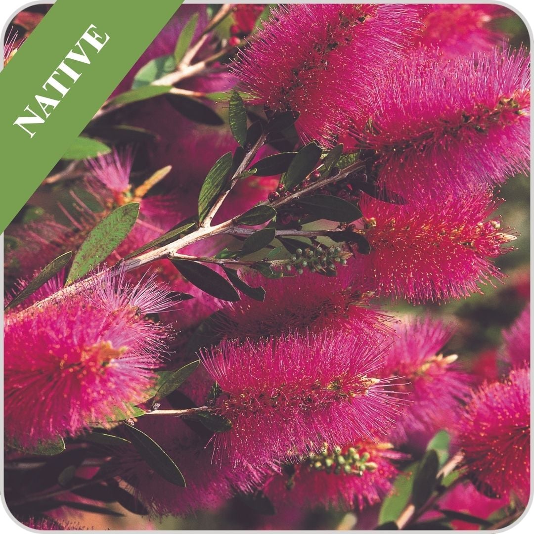 An Australian native shrub with shiny green leaves that emerge in shades of pink to complement the striking, bright pink bottle brush flowers.