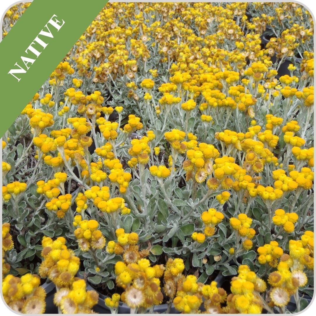 Chrysocephalum 'Desert Flame'P is an Australian native perennial that grows to a height of 20cm and spreads to 50cm from its crown and thrives in gardens or large pots. 'Desert Flame'P is described by the Australian National Botanic Gardens, Canberra as decumbent, which means that the stems lie flat along the ground with the button-like clusters of yellow flowers turning upwards to a height of 15cm. 'Desert Flame'P is hardy and tolerates heat and drought.