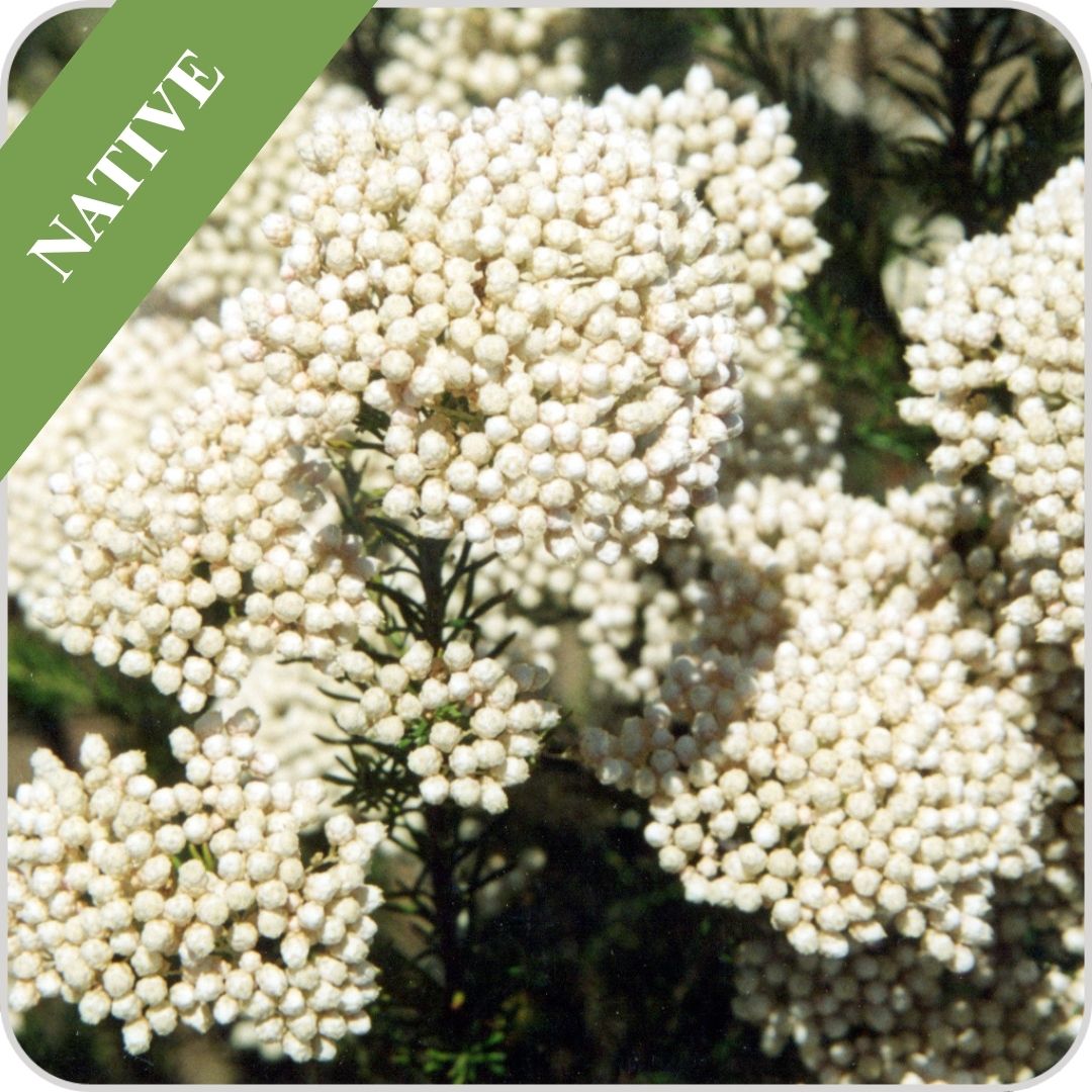 A compact, native Australian shrub with evergreen, fern-like foliage and heavy masses of soft white, rice-like buds followed by papery bright flowers throughout Winter and Spring.